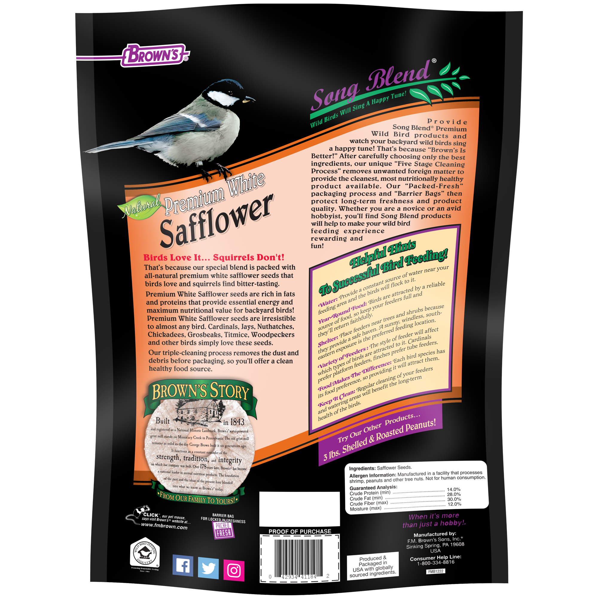 Brown’s® Premium White Safflower Seeds are rich in the fats and proteins that provide essential energy and maximum nutritional value for backyard birds! Premium White Safflower Seeds are irresistible to almost any bird. Cardinals, Jays, Nuthatches, Chickadees, Grosbeaks, Titmice, Woodpeckers, and other birds simply love these seeds.